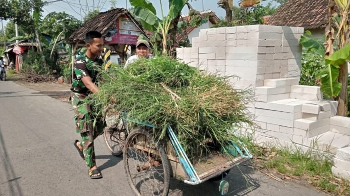 Di bawah terik matahari siang, seorang prajurit TNI menunjukkan semangat gotong royong. Praka Angga, anggota Satgas TNI Manunggal Membangun Desa (TMMD) Ke-127 Kodim 0819/Pasuruan,