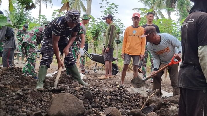 Puluhan anggota TNI bersama warga tampak bahu-membahu dalam proses pembangunan. Nampak di lokasi, para prajurit dan masyarakat bekerja dengan penuh semangat, menyatu dalam semangat kebersamaan demi mewujudkan akses yang lebih baik bagi masyarakat pedesaan.
