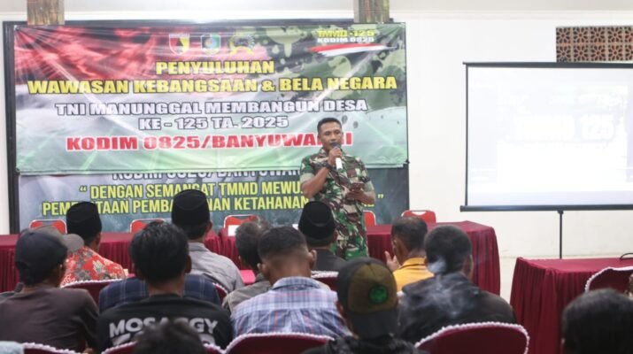BANYUWANGI – Satgas TNI Manunggal Membangun Desa (TMMD) ke-125 Kodim 0825/Banyuwangi melaksanakan kegiatan penyuluhan Wawasan Kebangsaan (Wasbang) di Desa Kesilir, Kecamatan Siliragung, Kabupaten Banyuwangi, Selasa (05/08/2025). Kegiatan ini merupakan bagian dari program non-fisik TMMD yang bertujuan untuk memperkuat rasa cinta tanah air dan menumbuhkan semangat nasionalisme di tengah masyarakat.