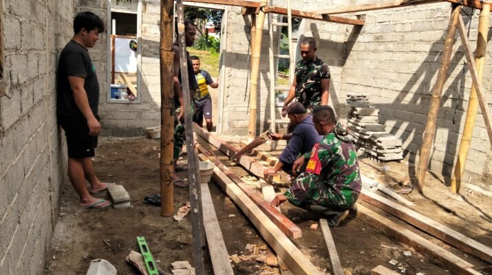 Babinsa Desa Kesilir, Sertu Bambang Darmawan, bersama anggota TNI lainnya dan warga setempat, melaksanakan kerja bakti membangun rumah milik Ibu Umiyati, salah satu warga yang mendapatkan bantuan dalam program TMMD tahun ini. Kegiatan ini tidak hanya mempercepat proses pembangunan rumah, tetapi juga mempererat hubungan antara TNI dan masyarakat.