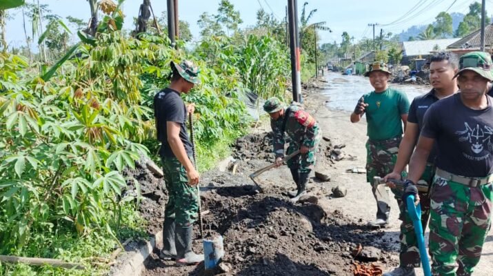 Lumajang — Personel Koramil 0821-14/Pronojiwo bersama Personel Yonif 527/BY melaksanakan kegiatan pengerukan saluran irigasi yang tertimbun material vulkanik di sepanjang jalur pertanian warga, Senin