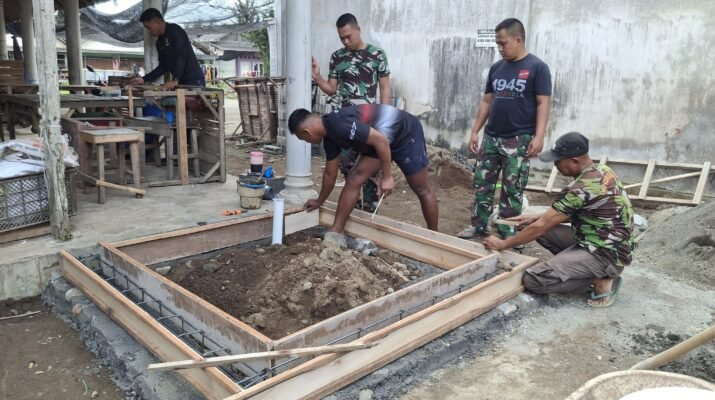Tampak dalam foto, para anggota TNI dan warga bekerja sama dalam proses pengecoran dasar dan pemasangan saluran pembuangan. Tak hanya tenaga, warga juga turut serta memberikan dukungan material demi kelancaran pembangunan.